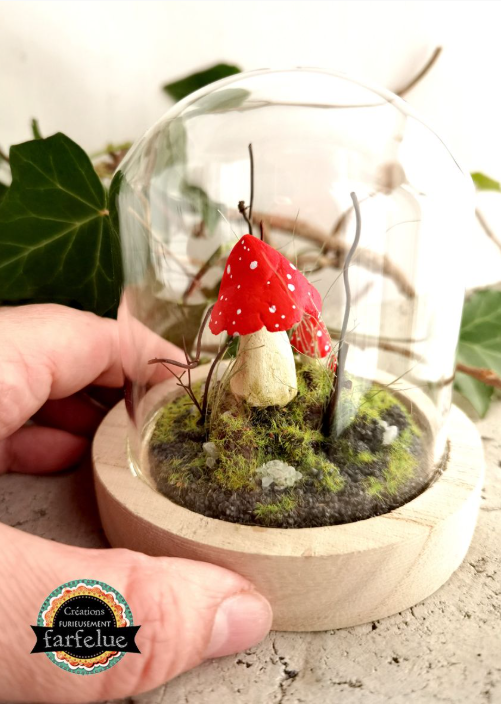 Prenons un instant pour contempler ce trio de champignons qui se démarquent du paysage frais et verdoyant par leur couleur rouge. Une nature de toute beauté qui procure une sentiment de calme et étincellante avec ses petits cristaux de quartz blancs