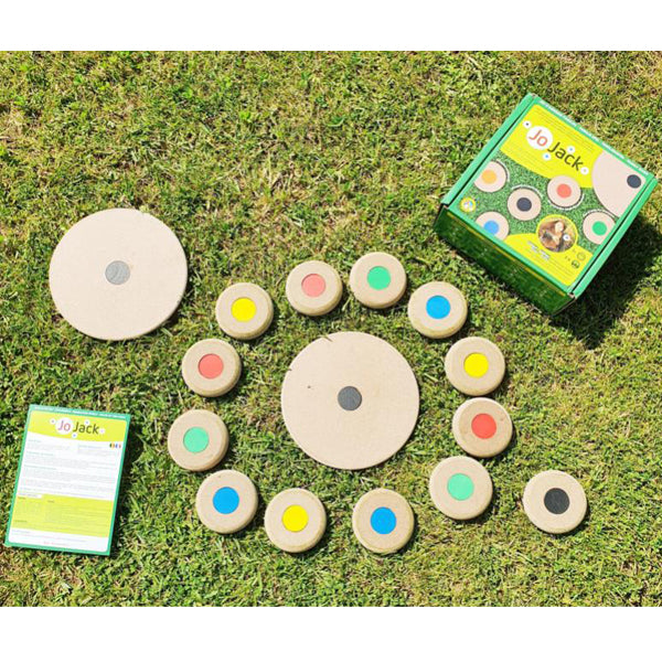 Le jeu en bois Jo Jack se joue à deux joueurs qui lancent à tour de rôle une petite pièce en bois pour faire tomber des quilles disposées en cercle. Le but est de renverser le plus de quilles possible pour marquer des points. Simple et amusant, ce jeu favorise la précision et la concentration, idéal pour partager un moment convivial en famille ou entre amis.