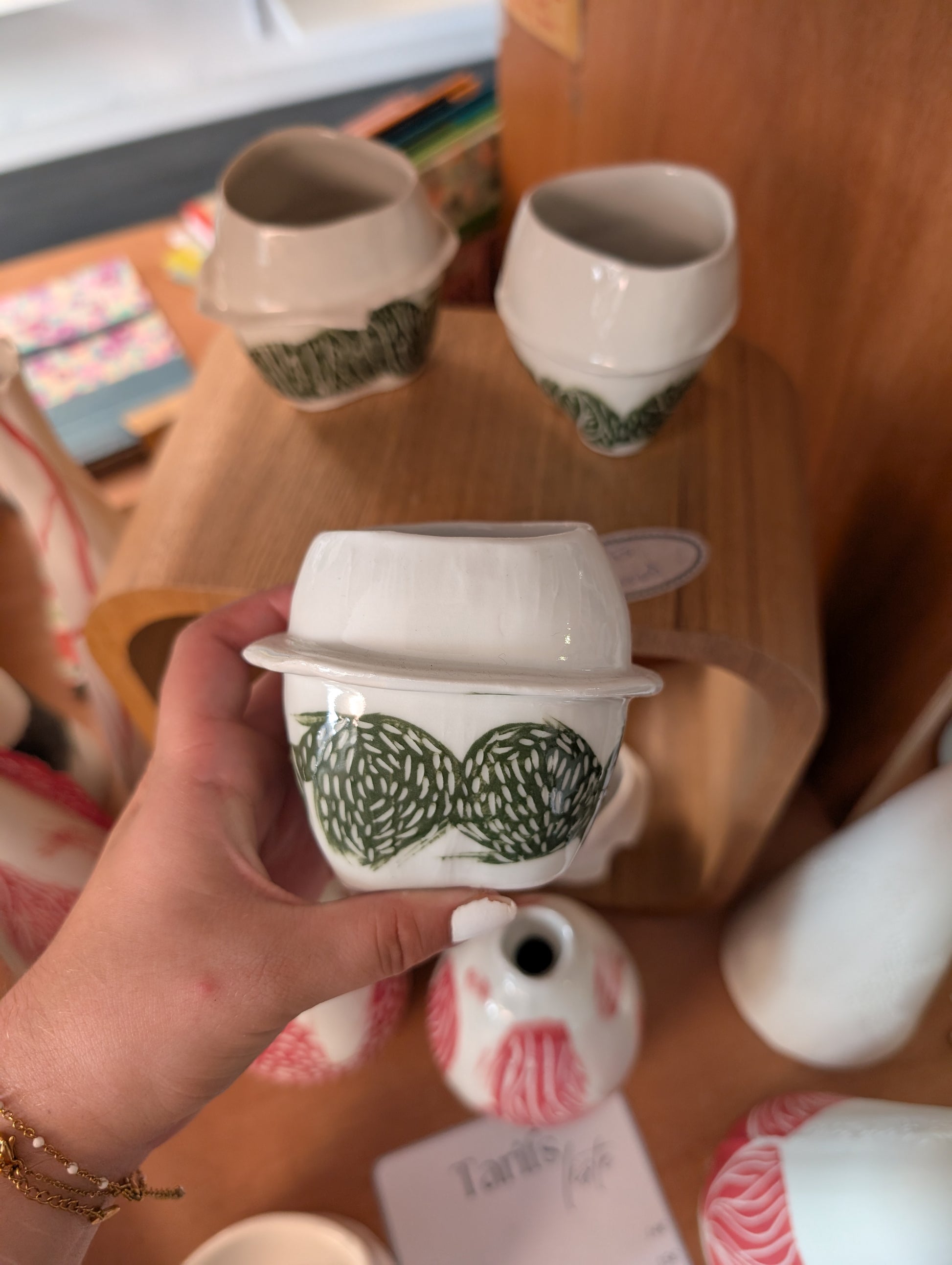 Pot en céramique décoré à la main, blanc et vert