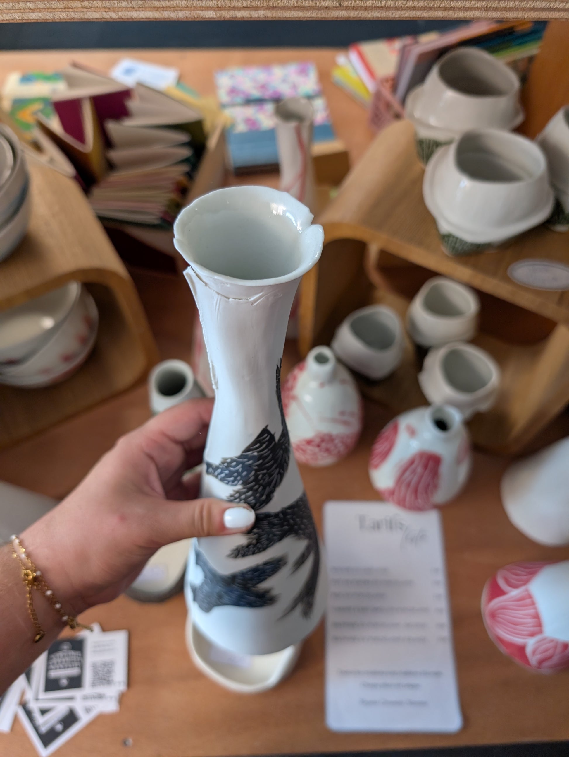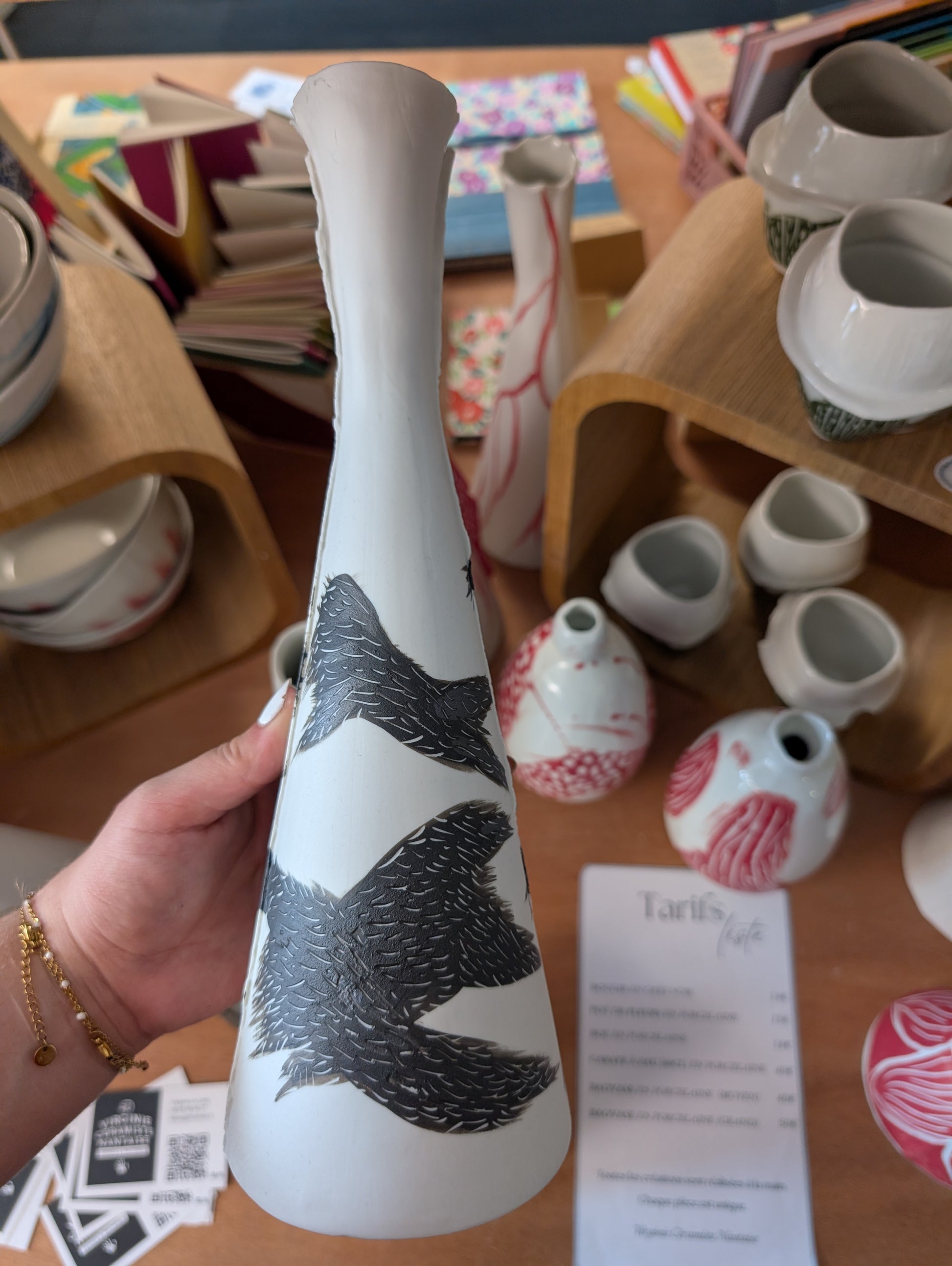 Vase en porcelaine blanc et noir réalisé et décoré à la main