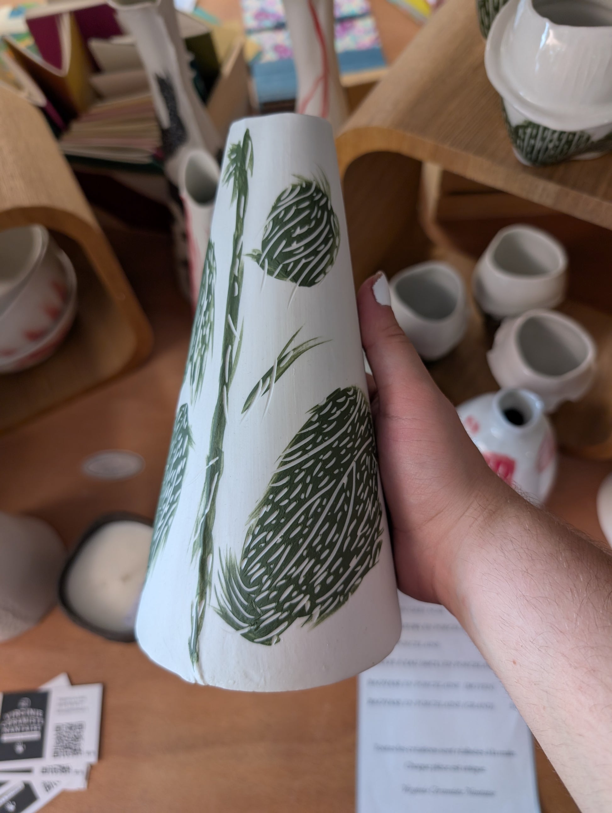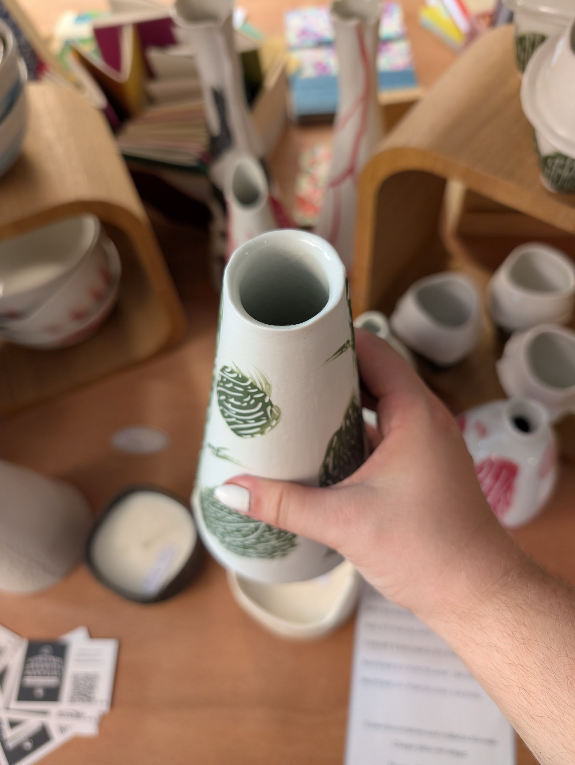 Vase en porcelaine blanc et vert réalisé et décoré à la main